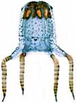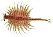 At the end of the Cambrian age, green algae and cyanobacteria made up the basal oceanic plankton. They were eaten by ciliates, amoebo-flagellates, radiolarians, and foraminiferans, which in turn were food for zooplankton: various larvae and small floating arthropods.
