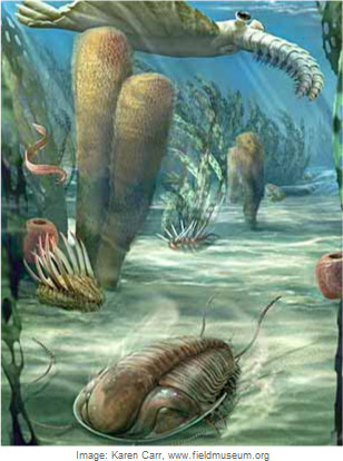 Further up the food-web, brachiopods and sponges filter-fed on the plankton, while jellyfish ate the larger zooplankton. Trilobites and mollusks scraped the sea-bed organic mats, other arthropods hunted actively, while an army of worms and chordates scavenged for left-overs.