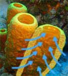 Sponges force water through pores into an internal, usually convoluted, canal system, acting as a chimney sucking water upwards. Cells differentiate into choanocells with flagella, and generalized cells that make the pores, outer layer ... They are diploid, and reproduce by budding into a colony; but seasonally, they may produce motile gametes that reach other receptive sponges to produce a larva, which disperses away from its parents.